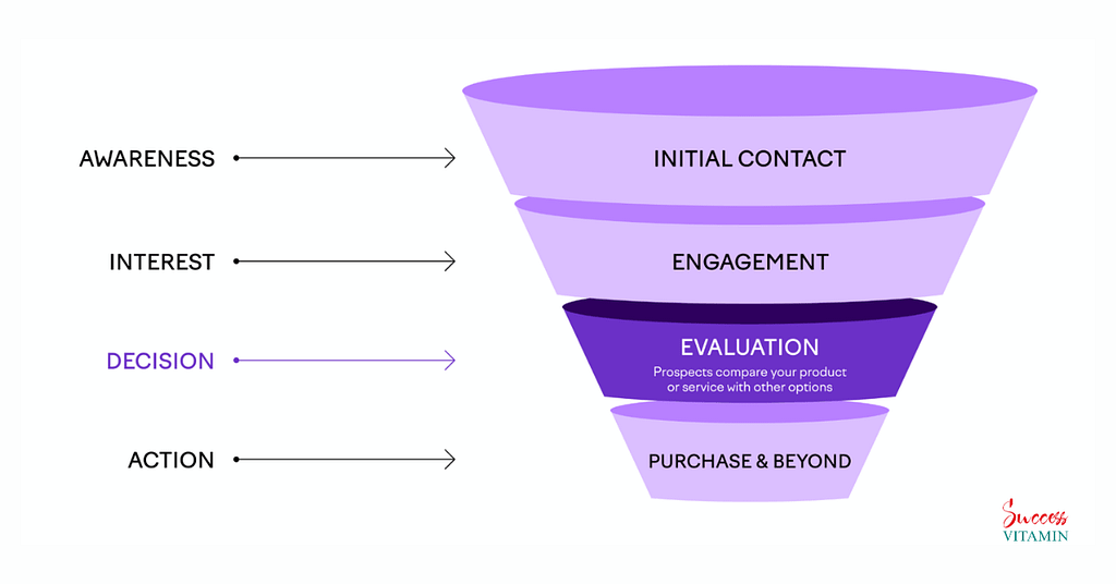 The sales funnel (imagine a funnel) represents the journey that leads from initial awareness(Oh! A problem exists phase) to the final conversion(Oh, I have a solution here phase) into paying customers.